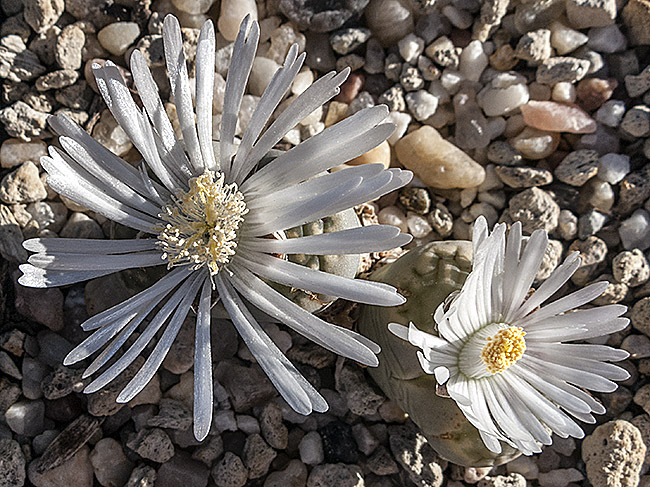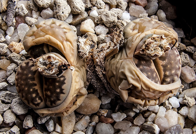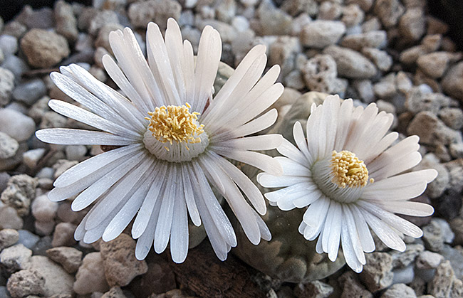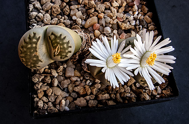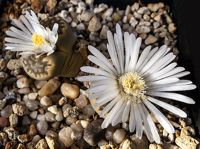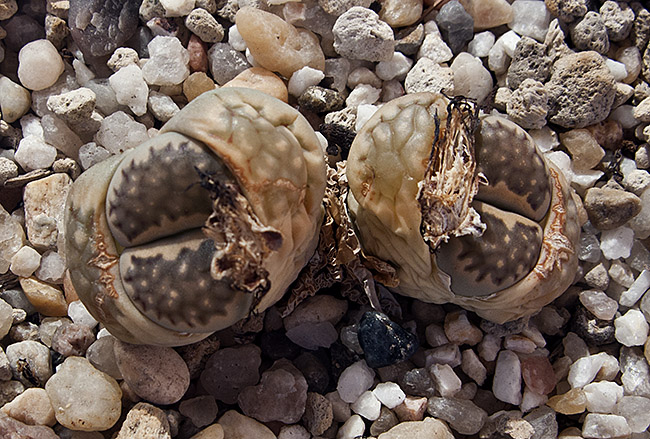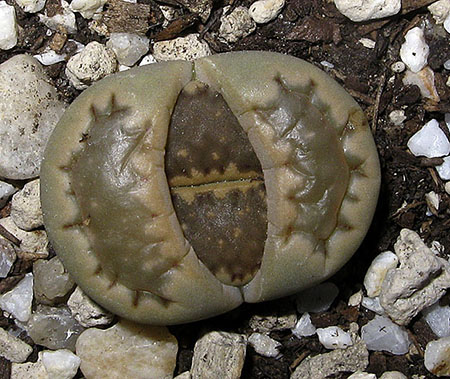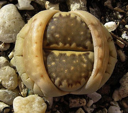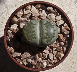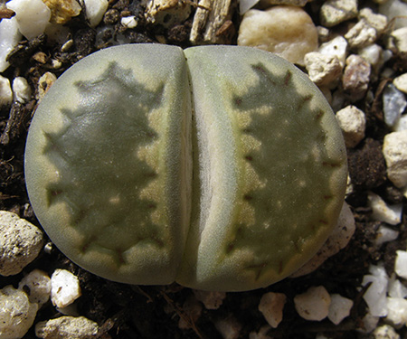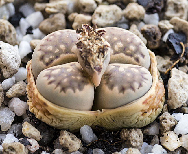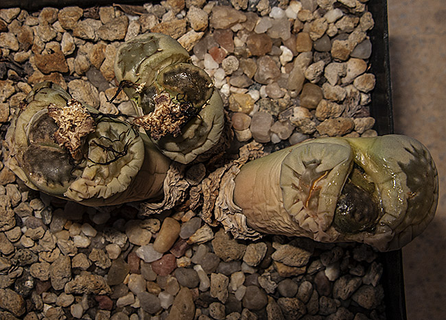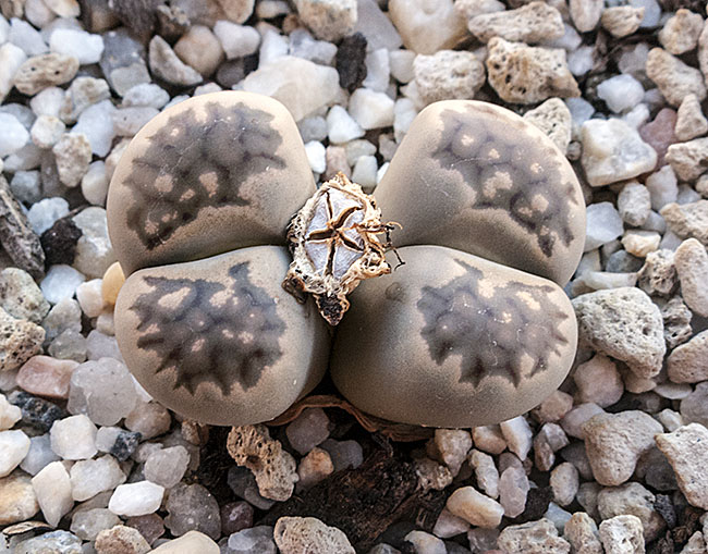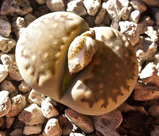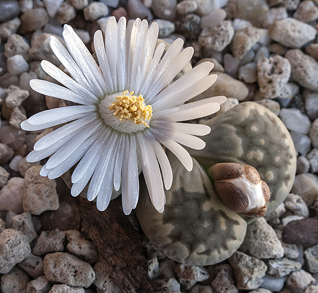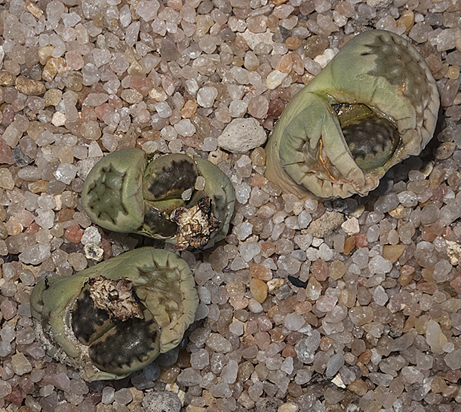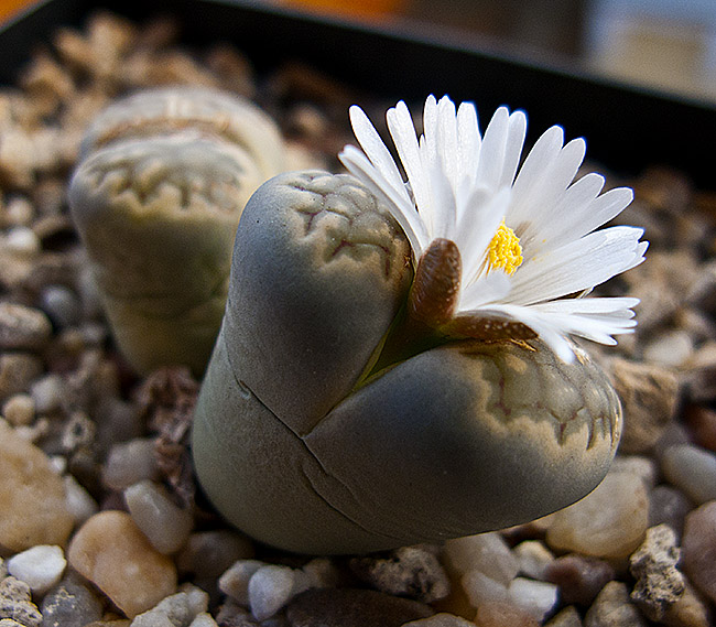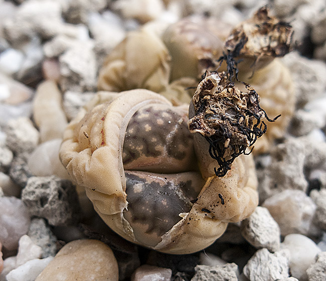 13 de julio de 2013 (Sorprendentemente tiene una cápsula llena de semillas. Dado que en el momento de la polinización no tenía ninguna otra planta de esta especie, sólo caben dos posibilidades: O ha sido una autopolinización o es un hibrido. No creo que haya sido una autopolinización, así que me inclino más por que haya habido un cruce. Las únicas especies con la que coincidió en la floración fueron: L. aucampiae, L. bromfieldii, L. julii y L. kasramontana. Y, de estas cuatro, sólo las dos últimas dan flores blancas, por lo que pienso que es posible que sea con ellas con las que puede haber hibridado. ¡Ya veremos!)