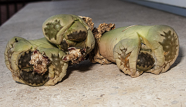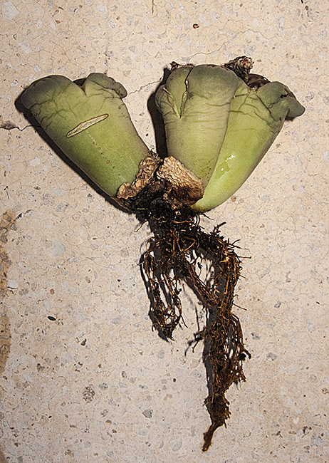 18 de febrero de 2012 (La regeneración avanza rápidamente. Mañana empezaré a regar de nuevo, porque considero que ya está lo suficientemente seca la cabeza anterior. Como en varios ejemplares, el efecto de una alta exposición al sol está produciendo un oscurecimiento del color verde original.)
