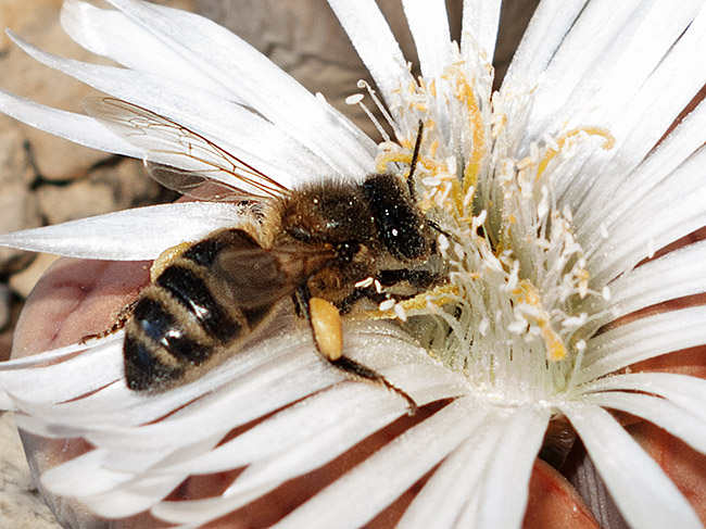 7 de noviembre de 2015 (Finalmente la abeja se marchó volando . . . ¡con dos bolas de polen, una en cada una de sus patas traseras!)