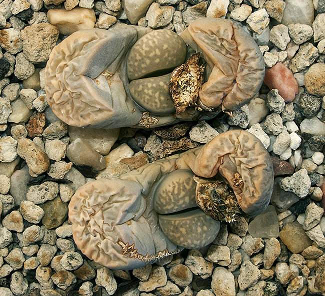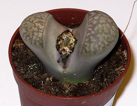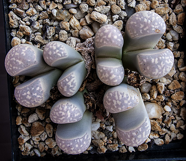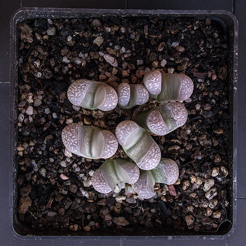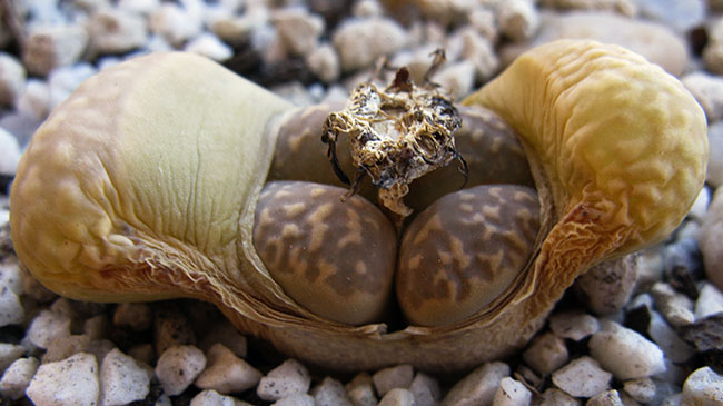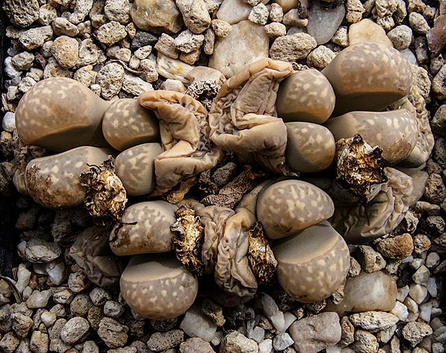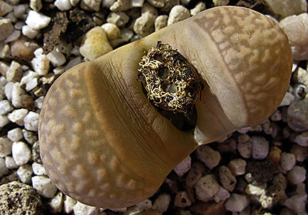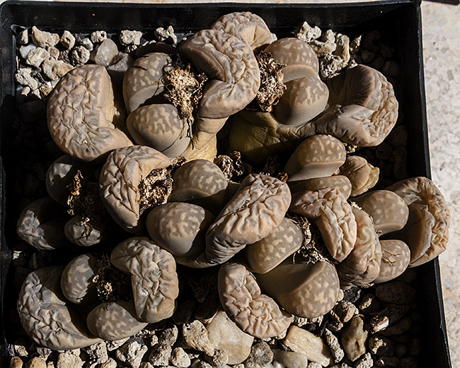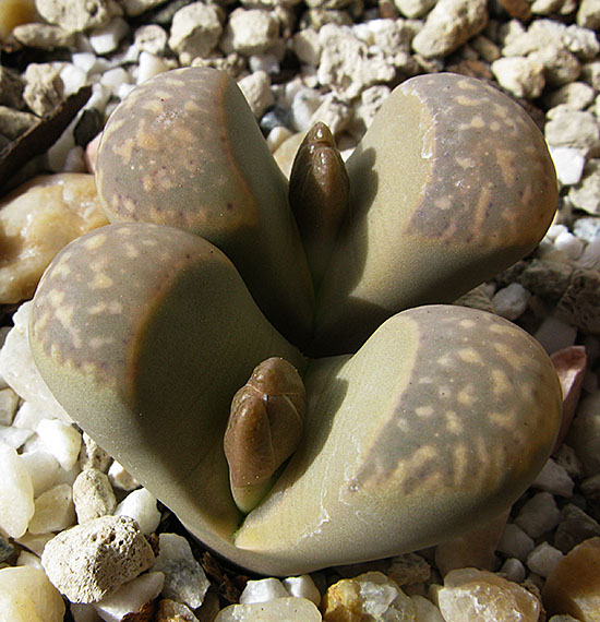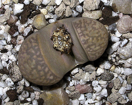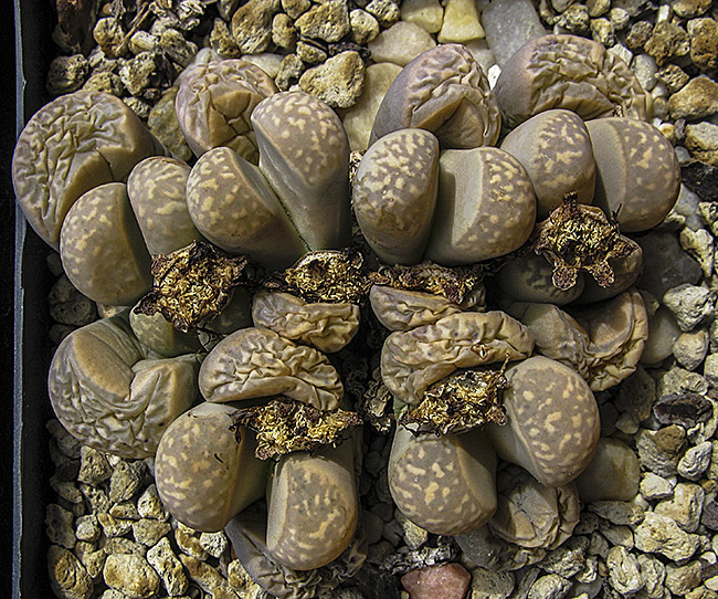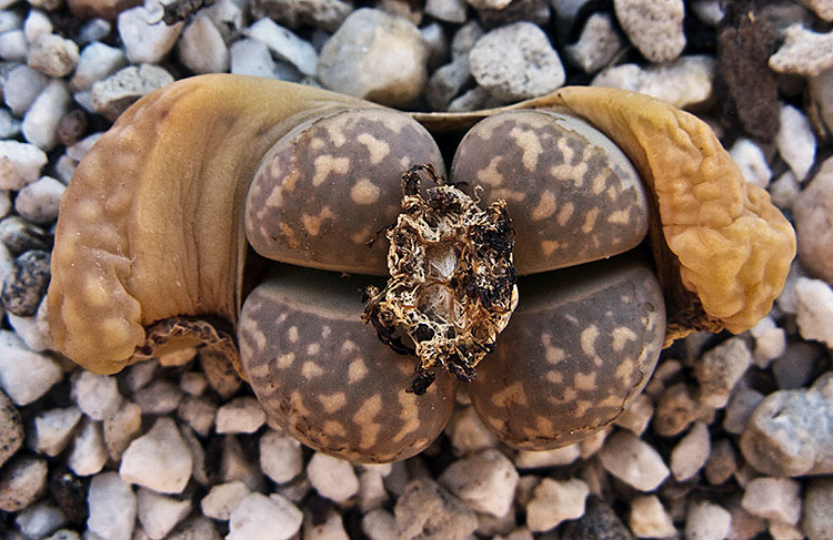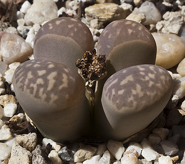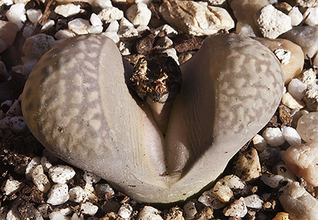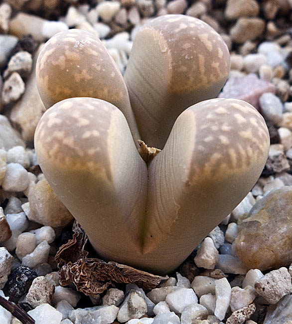 15 de abril de 2012 (Las hojas viejas continúan sin secarse lo suficiente como para empezar a regar. La falta de riego hace que las hojas nuevas no se desarrollen más vigorosamente. Parece un círculo vicioso, pero . . . ¡voy a seguir sin regar! Ya van cuatro meses en los que este lithops no ha recibido ni una sola gota de agua.)