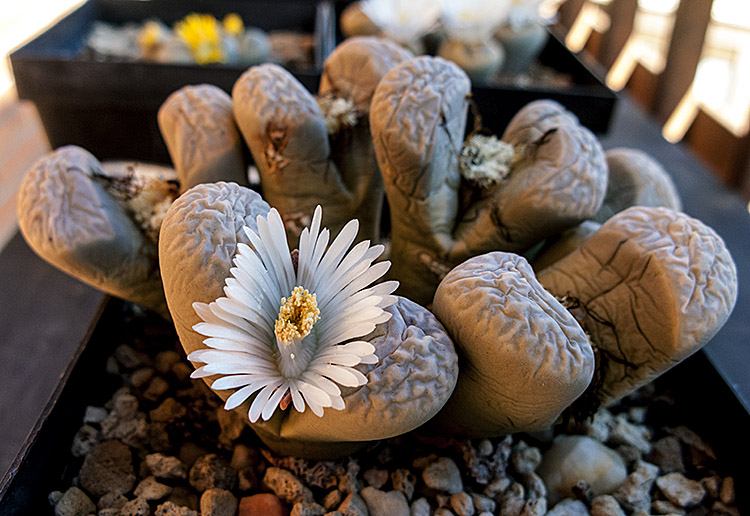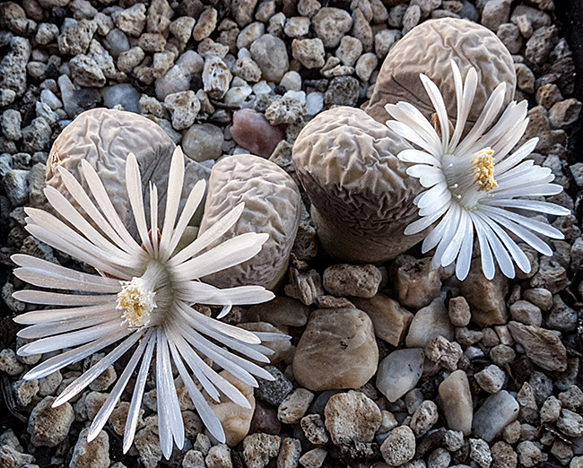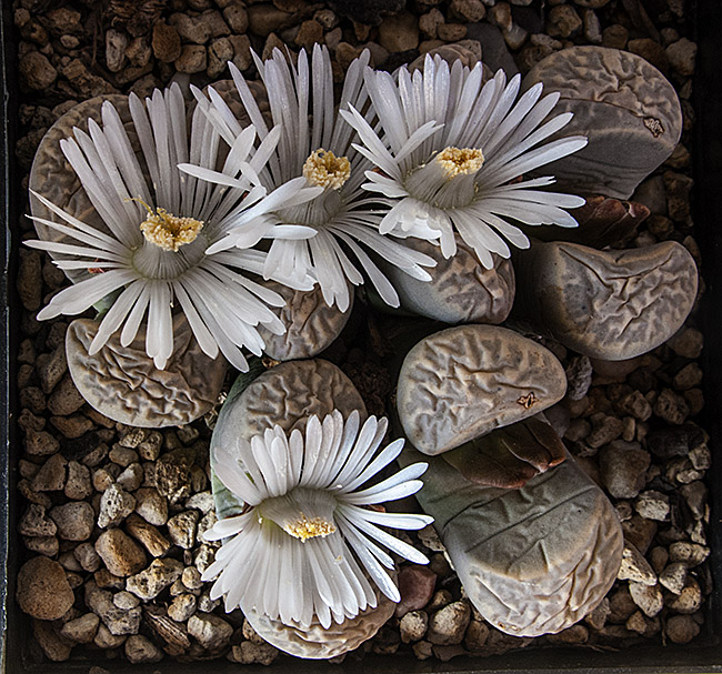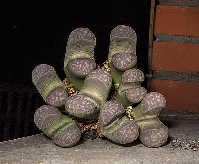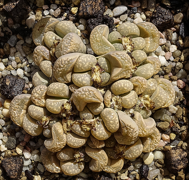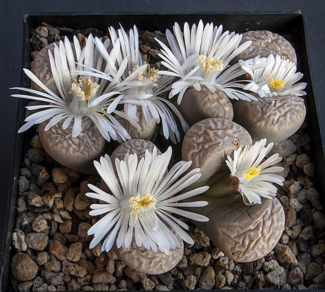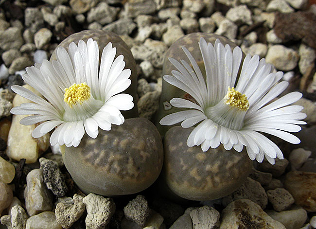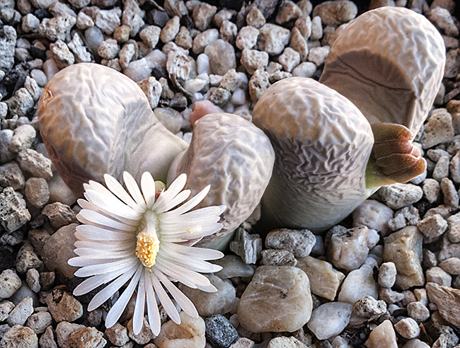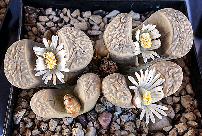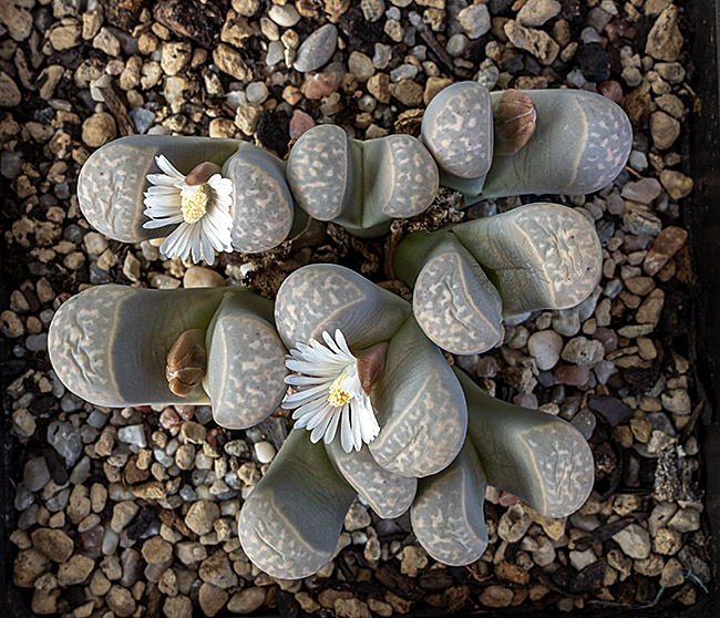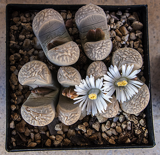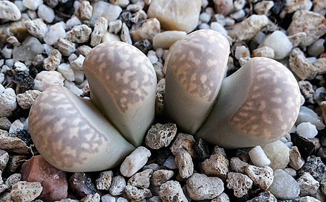 15 de abril de 2012 (Las hojas viejas continúan sin secarse lo suficiente como para empezar a regar. La falta de riego hace que las hojas nuevas no se desarrollen más vigorosamente. Parece un círculo vicioso, pero . . . ¡voy a seguir sin regar! Ya van cuatro meses en los que este lithops no ha recibido ni una sola gota de agua.)