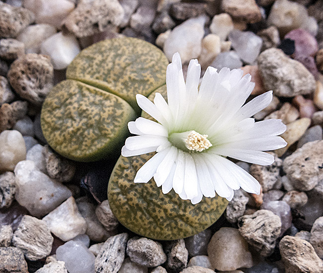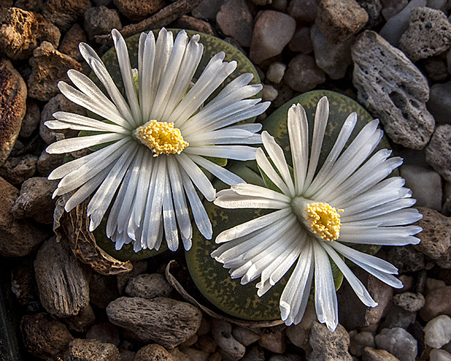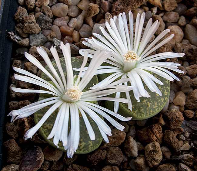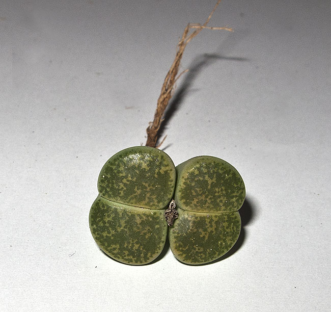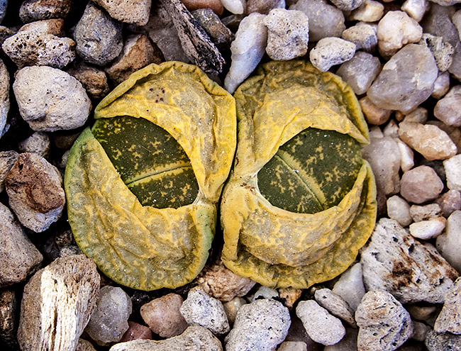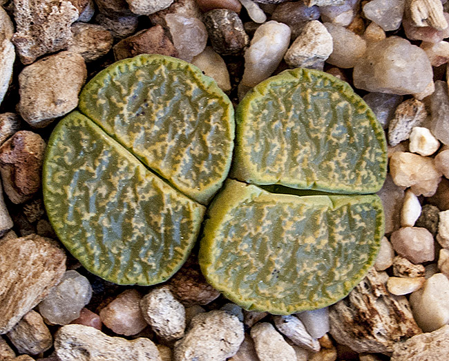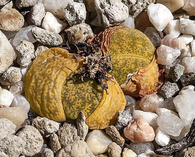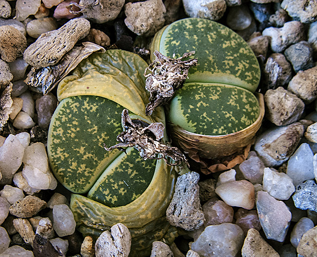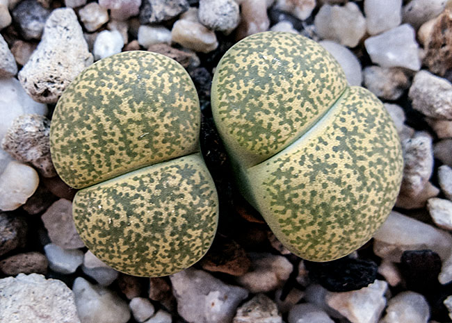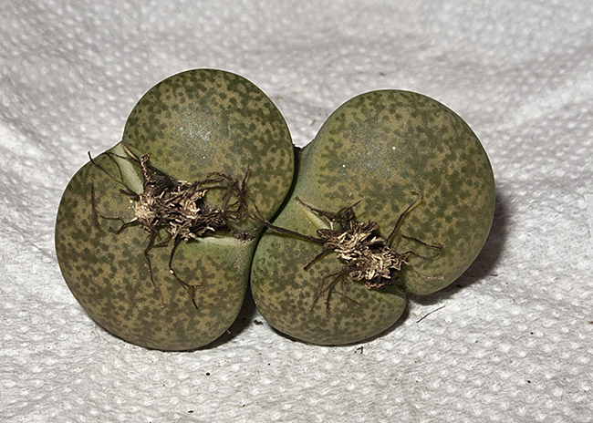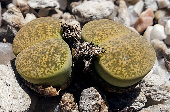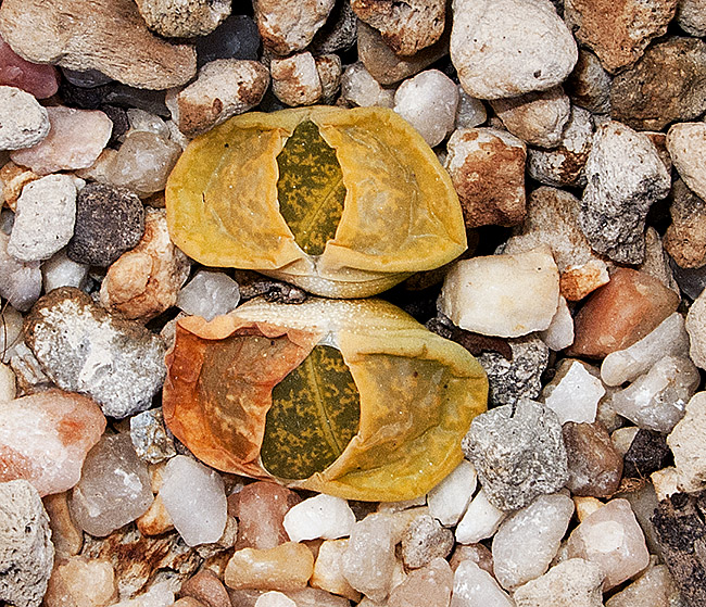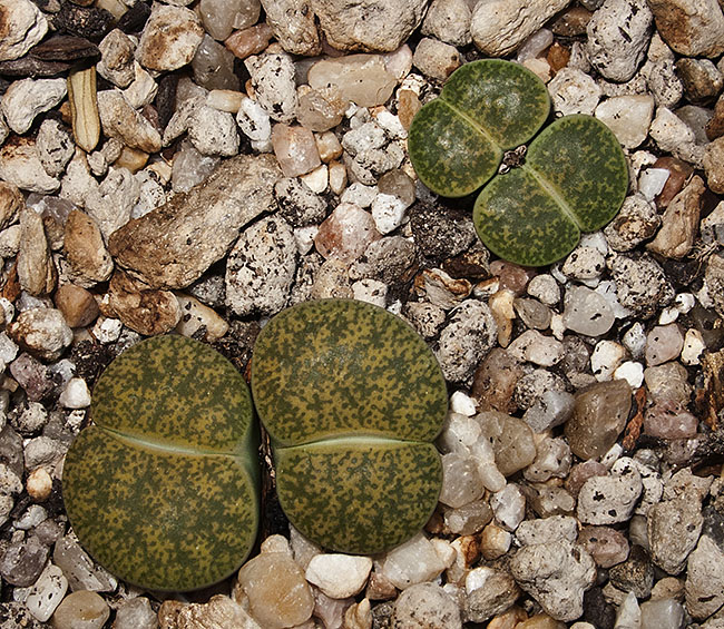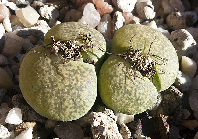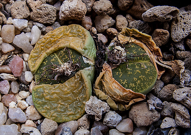 27 de julio de 2014 (El terrible sol de finales de julio hace estragos en mis Lithops. A pesar de que los tengo protegidos con una malla de sombreado, por la disposición física de mí terraza es imposible hacerlo perfectamente y, como se ve en esta foto, a veces se quema [literalmente hablando] sólo parte de una cabeza: justo donde da el sol sin protección a las horas más duras. Me temo que esa cabeza está perdida.)