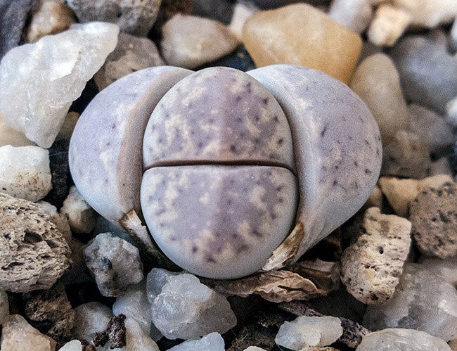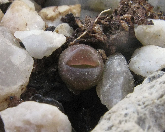 8 de junio de 2014 (Casi quince meses después de haber sembrado, este ejemplar ya ha realizado varias mudas y, aunque todavía no florecerá este año, ya está siendo tratado como un Lithops adulto.)