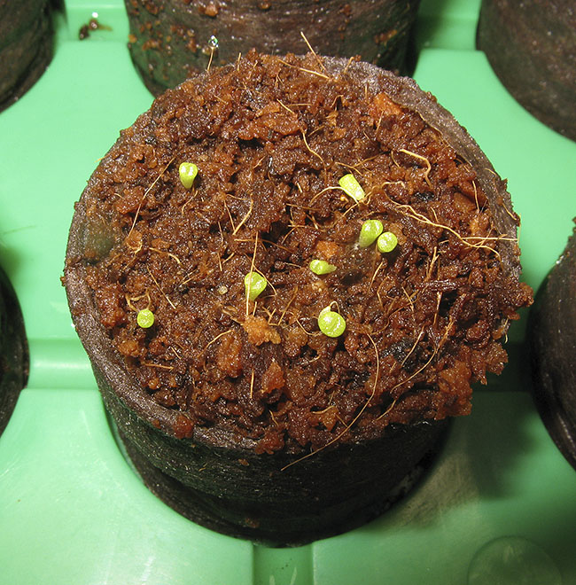 10 de abril de 2013 (Ochenta y dos días después de haber sembrado, las pequeñas plántulas de Lithops optica 'Rubra' están sanas, fuertes y . . . ¡ya se les ve 'rubras'!)
