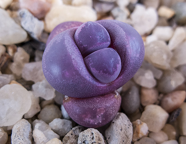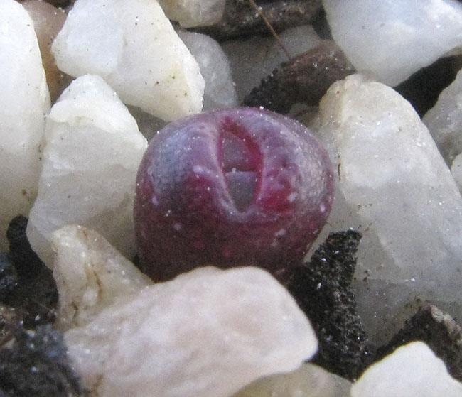 8 de junio de 2014 (Casi quince meses después de haber sembrado, este ejemplar ya ha realizado varias mudas y, aunque todavía no florecerá este año, ya está siendo tratado como un Lithops adulto. Este ejemplar está haciendo las mudas con mucha frecuencia, incluso antes de haber secado las mudas de la generación anterior.)