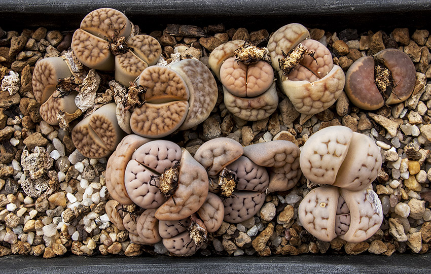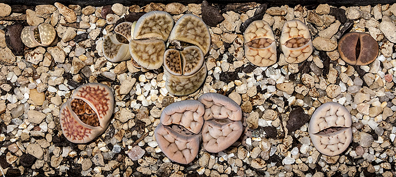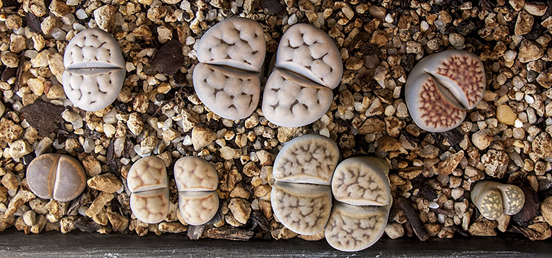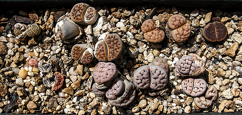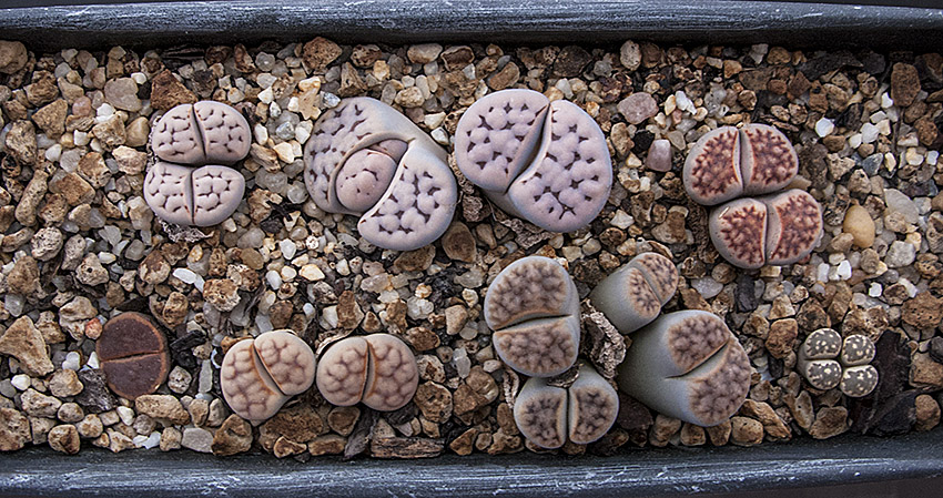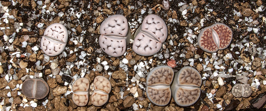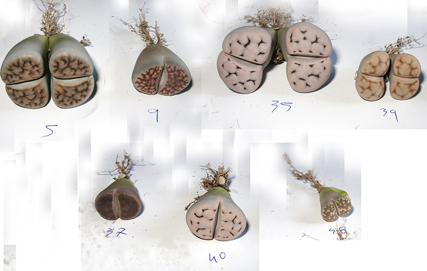 6 de septiembre de 2015 (Dos ejemplares cultivados desde semilla [semillero: SE-04 / fecha de siembra: 03-03-2012]. Todos ellos son Lithops karasmontana, excepto uno que, según creo, es un Lithops aucampiae.)