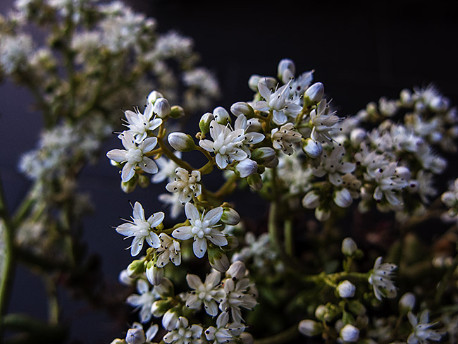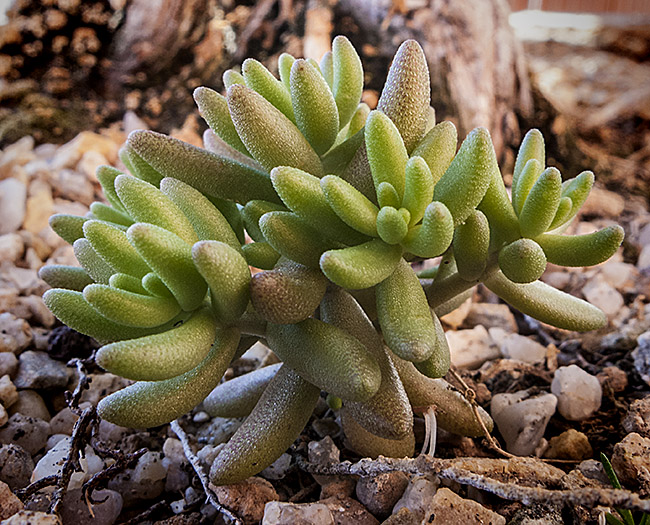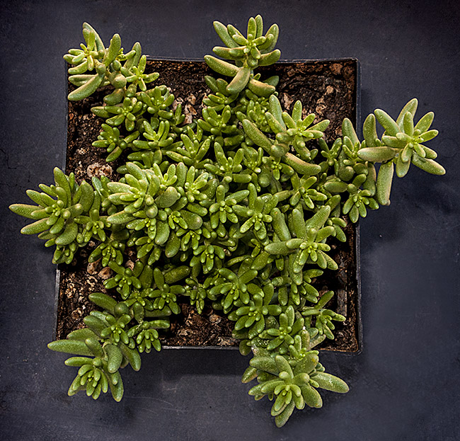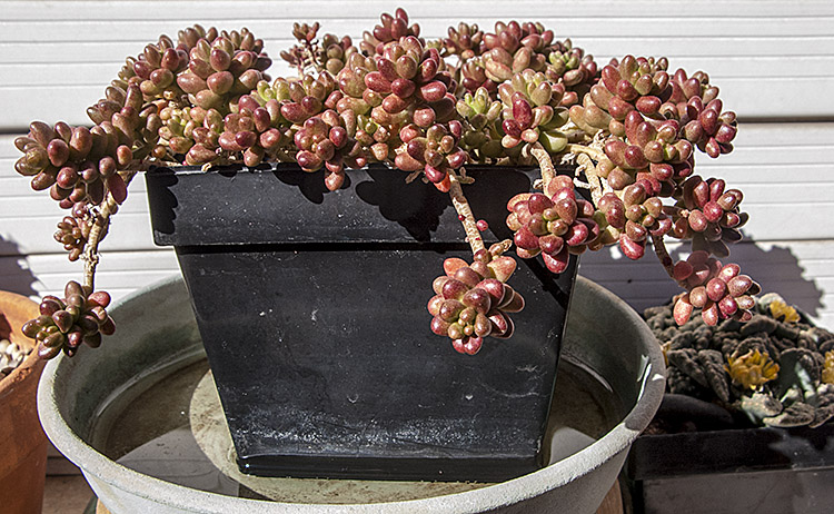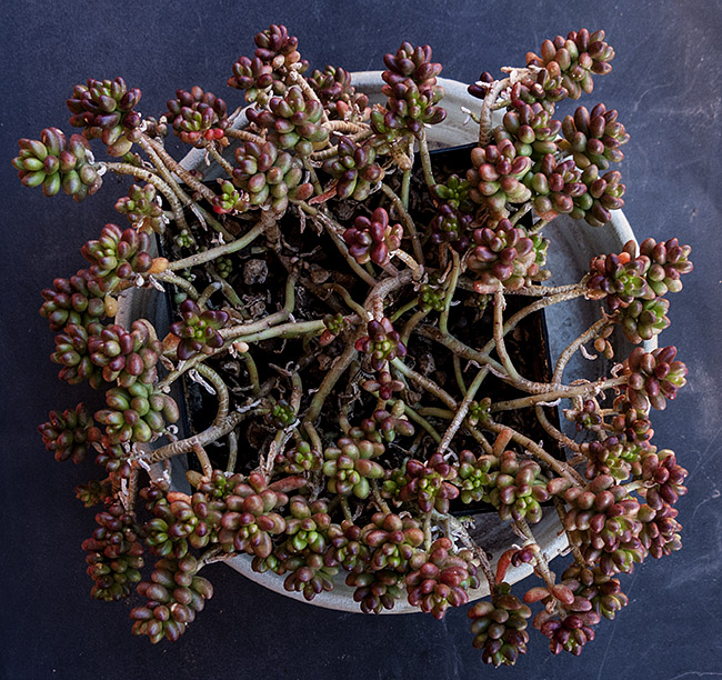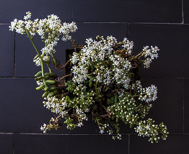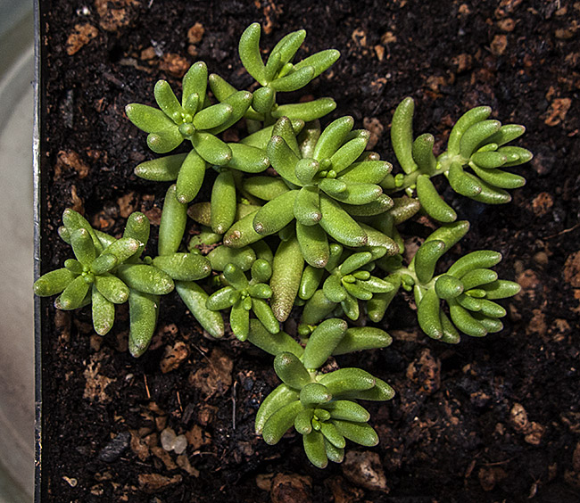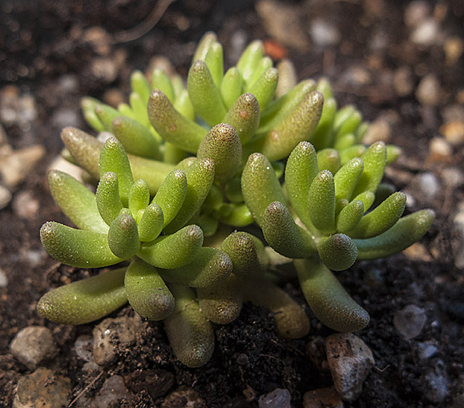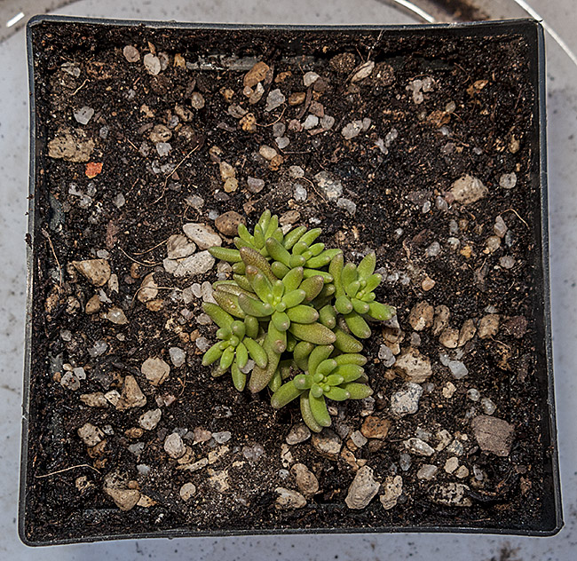 6 de marzo de 2017 (Recién trasplantada. Según he leído en Flora Ibérica de Santiago Castroviejo, los nombres vulgares más utilizados en España para el Sedum album son: Uva de gato, uva de perro, pampajarito grana, arroz, platanicos y vermicularia.)