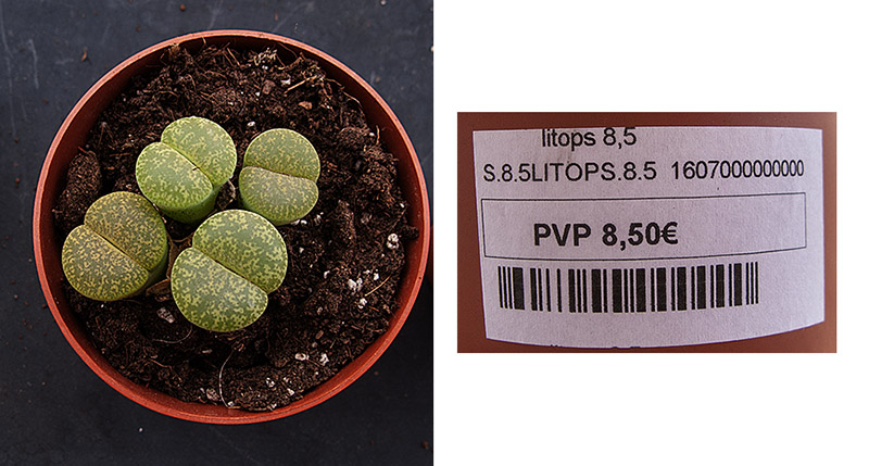 Como puede verse en las siguientes fotos, en las etiquetas de las macetas que había en Cacto Cacto no ponía " Lithops lesliei 'Albinica' ", sino que ponía " Lithops 8.5 ". Me hizo gracia ver como sustituyen el nombre de la especie por el precio, ¡me pareció significativo!