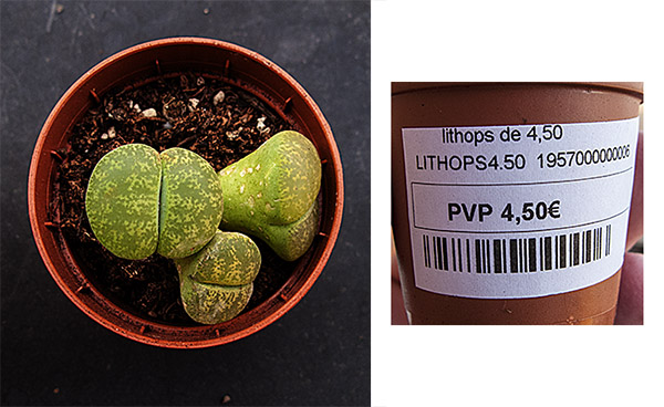 Precisamente por eso (porque sé que no me están engañando), aunque prefiero comprar en lugares donde me garanticen la identificación de las plantas que compro, cuando paso por casualidad por un sitio como Cacto Cacto suelo caer en la tentación y entro a darme una vuelta y si, como en este caso, veo unos estupendos ejemplares de Lithops lesliei 'Albinica' . . . pues, a pesar de todo, voy y los compro. Sobre todo si se trata de una especie de la que sólo tenía dos ejemplares y estaba interesado en adquirir alguno más, cómo pasaba en esta ocación.