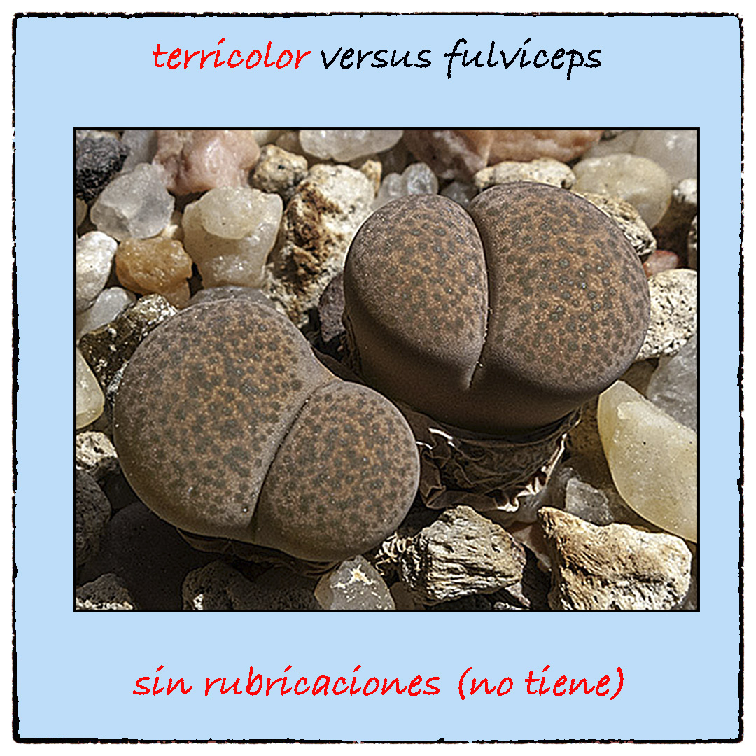 Los Lithops fulviceps presentan rubricaciones (como pequeñas líneas que parecen firmas diminutas); mientras que los Lithops terricolor no tienen dichas rubricaciones.