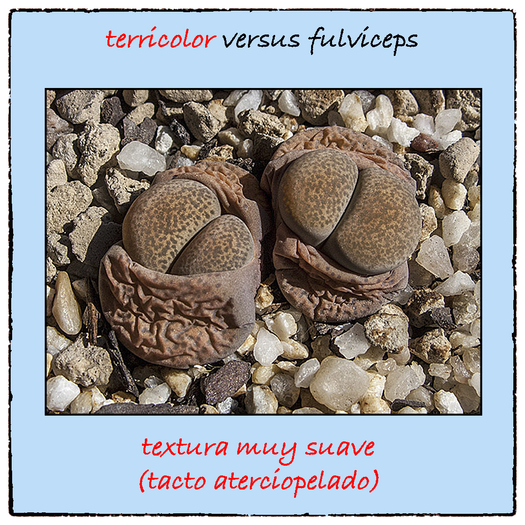 Los Lithops terricolor tienen una textura muy suave, como aterciopelada, mientras que los Lithops fulviceps tiene una textura ligeramente rugosa.