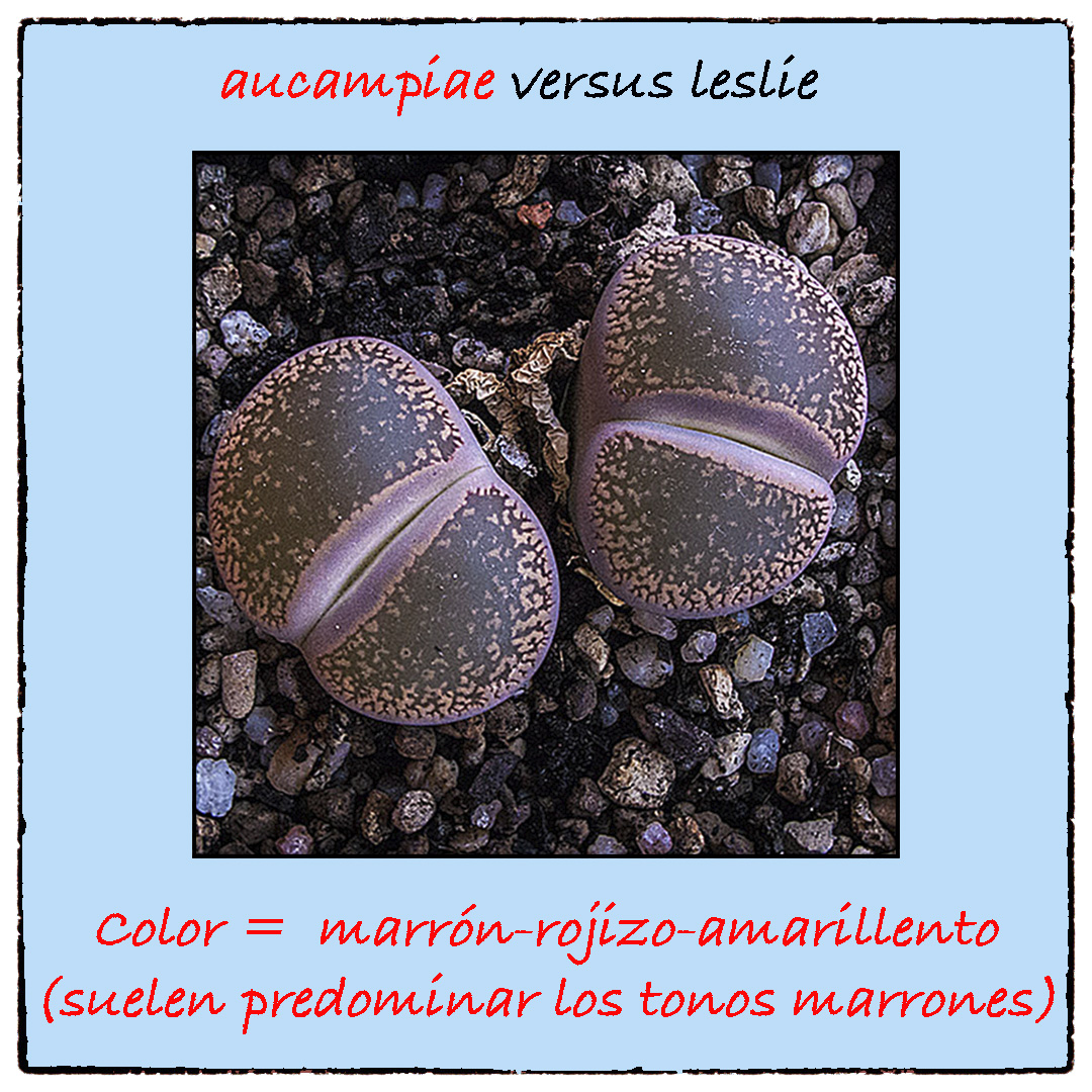 A veces las tonalidades parduzcas pueden ser dominantes tanto en uno como en otro caso, y eso puede hacer difícil distinguirlos, pero, en general, en los Lithops aucampiae suelen dominar los tonos marrones, mientras que en los Lithops lesliei los tonos dominantes suelen ser más bien verdosos.