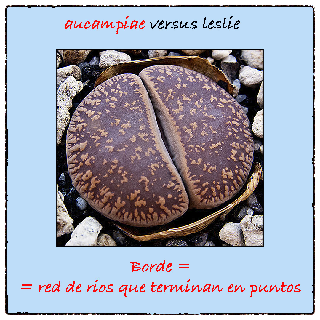 Una forma bastante útil para saber si estamos ante un Lithops aucampiae o ante un Lithops lesliei es fijarnos en los bordes superiores de sus hojas: si observamos una amplia red de finos ríos, que terminan en puntos, se tratará de un Lithops aucampiae, mientras que, si allí hay penínsulas, menos numerosas y más anchas que los ríos, se tratará de un Lithops lesliei.