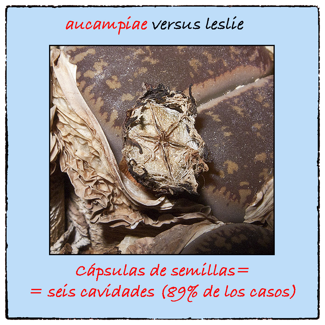 No siempre esto es así, a veces encontraremos excepciones en cuanto al número de cavidad de las cápsulas de semillas de unos y otros, pero más del 80% de las veces las cápsulas de los Lithops aucampiae tienen seis cavidades y, también más del 80% de las veces, las cápsulas de los Lithops lesliei tienen cinco cavidades.