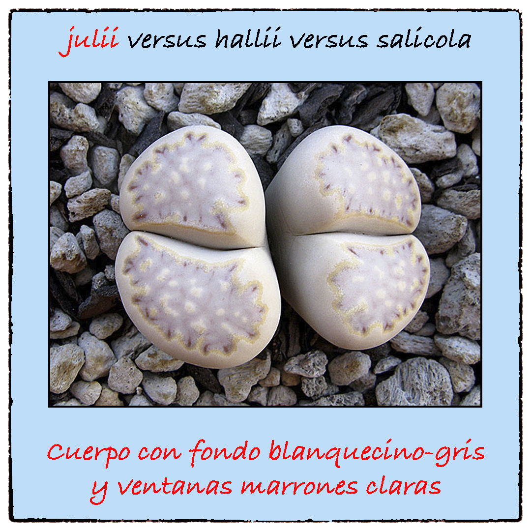 Si nos fijamos en los colores, el cuerpo de los Lithops julii suele ser más claros que el de los Lithops hallii y que el de los Lithops salicola. Los Lithops julii tienen un fondo blanquecino-grisaceo con ventanas marrones claras, mientras que los Lithops hallii tienen un cuerpo beige-marrón con ventanas marrones algo más oscuras. Finalmente, los Lithops salicola suelen tener un color verdoso (a veces tirando a gris) y grandes ventanas más oscuras.