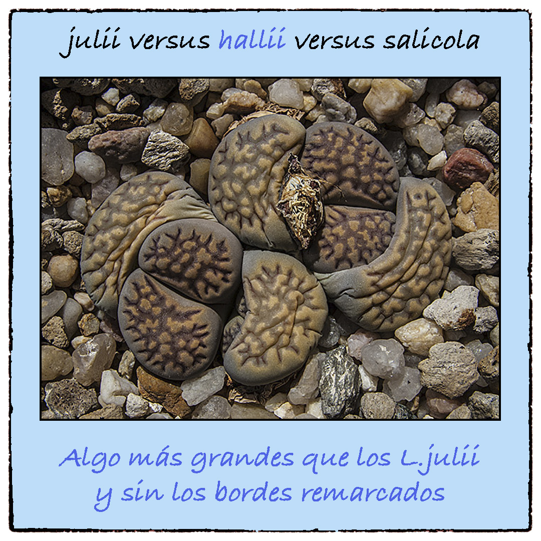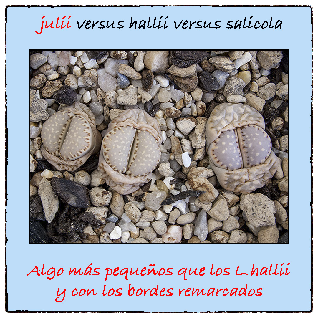 Si se trata de ejemplares muy adultos, los Lithops julii suelen tener un tamaño algo más pequeño que los Lithops hallii. Además, con frecuencia, los Lithops julii pueden tener la fisura bordeada con líneas o puntos más oscuros. Por su parte los Lithops salicola suelen ser ligeramente más pequeños que los Lithops julii y los Lithops hallii.