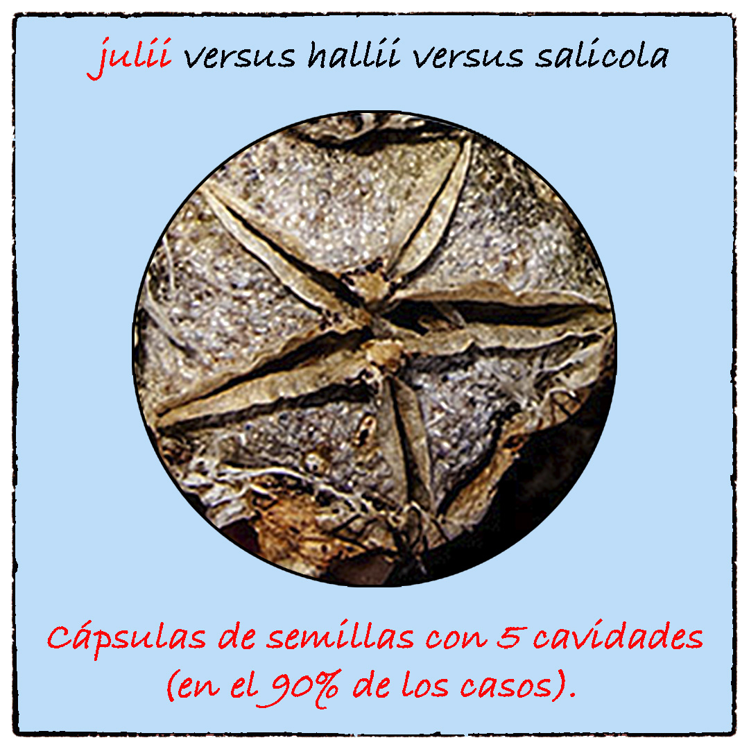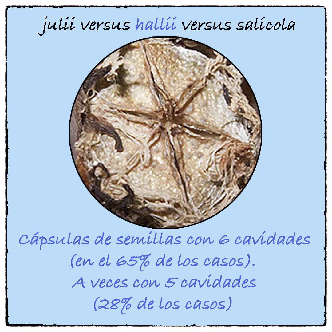 En caso de duda existe un tercer factor que nos puede resultar útil a la hora de diferenciar a los Lithops hallii ya que tanto los Lithops julii como los Lithops salicola suelen producir cápsulas de semillas con cinco cavidades; mientras que la mayoría de los Lithops hallii producen cápsulas de semillas con seis cavidades.
