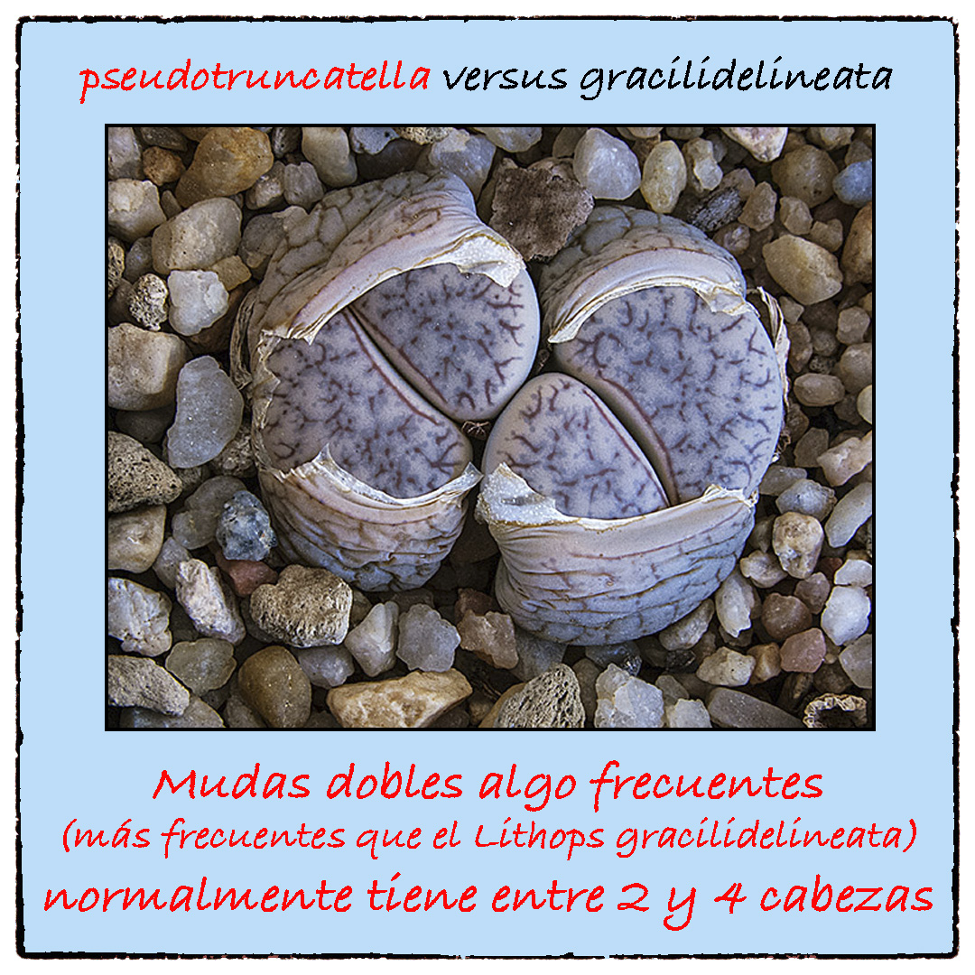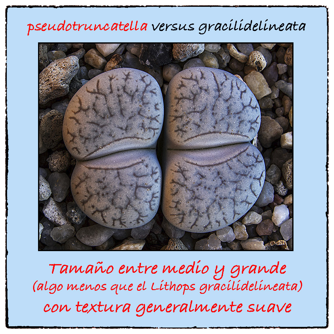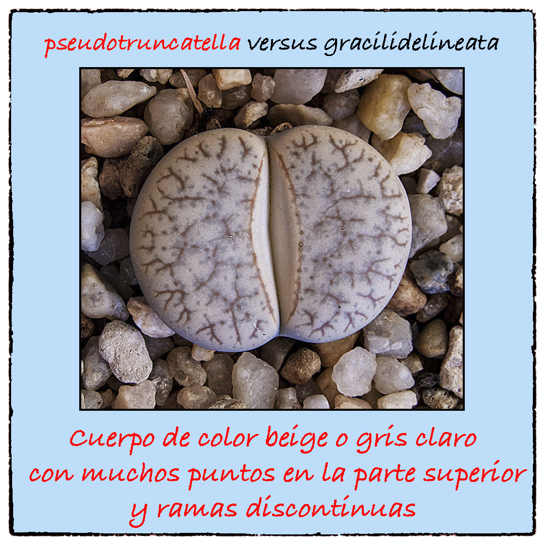 Los Lithops pseudotruncatella suelen tener ramas discontinuas y muchos puntos en la parte superior (a veces, para verlos bien, hace falta una lupa), mientras que los Lithops gracilidelineata también tienen líneas entrecruzadas en la parte superior, pero no suelen tener puntos.