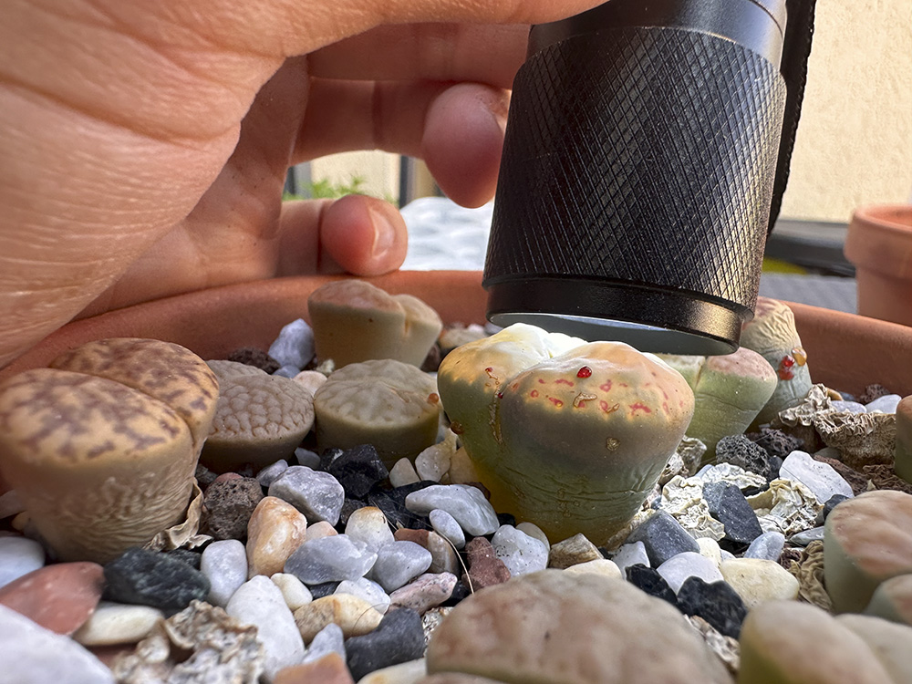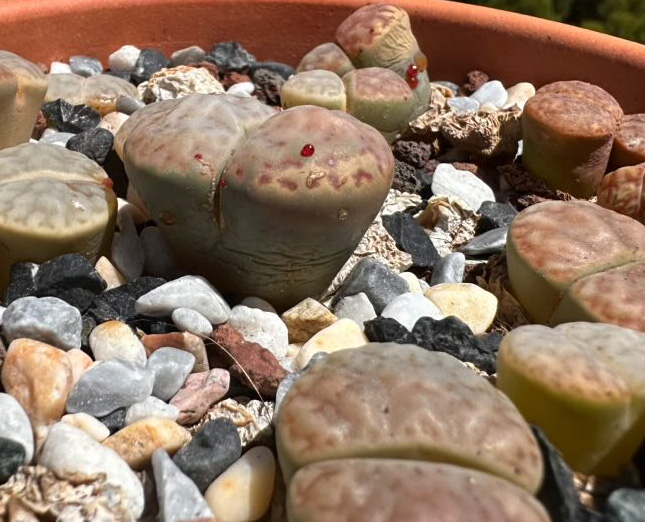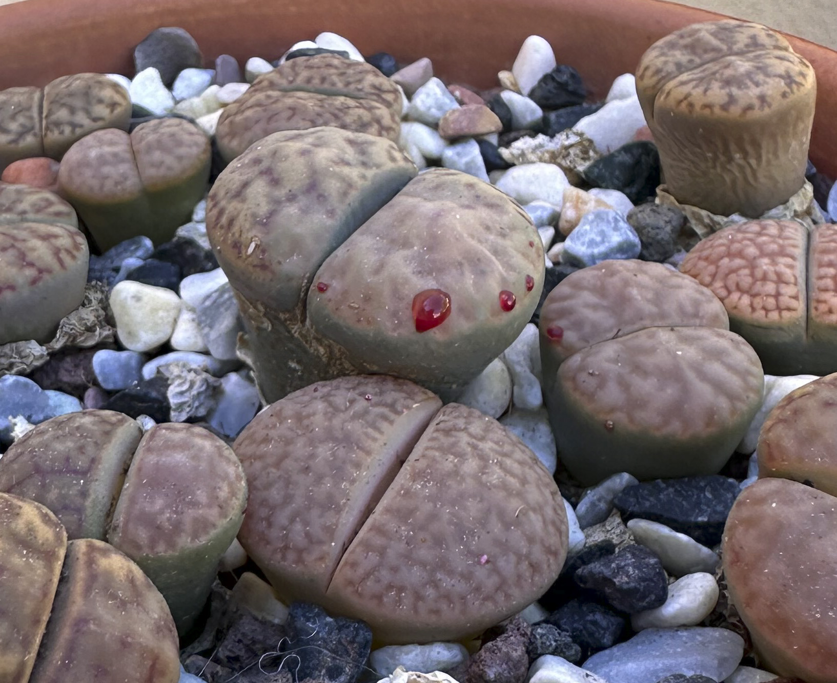 Siendo sinceros, yo jamás he visto sudar a mis Lithops, pero, en buena lógica, la transpiración podía ser un buen motivo para justificar las gotas de los Lithops de @CierzoSalvaje. Por estos lares estamos en pleno verano y hace mucho calor, así que sudar es algo razonable. Ahora solo nos quedaba responder a la pregunta más desconcertante: ¿por qué las gotas son de color rojo?