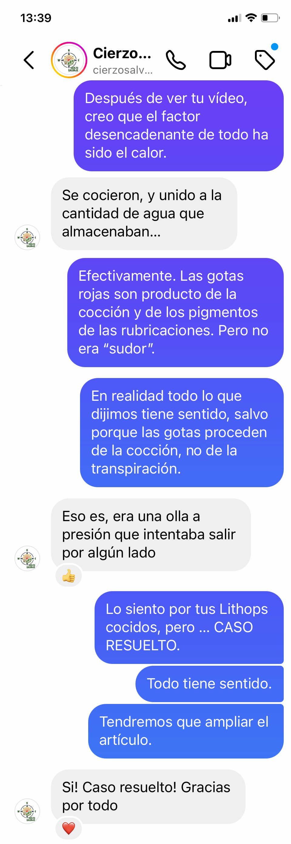 Podría ser que las gotas rojas fueran "sudor" producido por el Lithops, que absorbe los pigmentos rojos de las rubricaciones. Por eso, después de limpiar las gotas, las rubricaciones desaparecen (han pedido los pigmentos que las dan color).