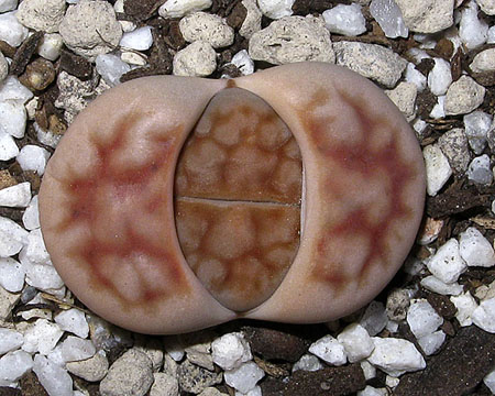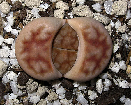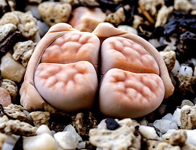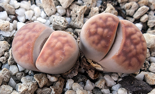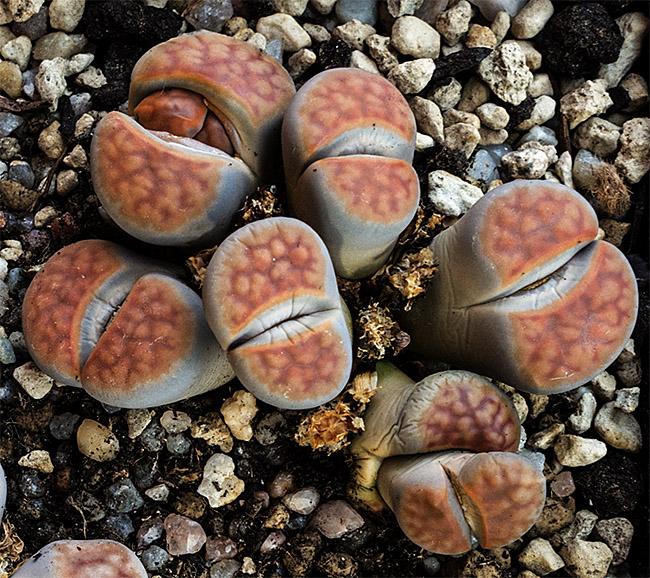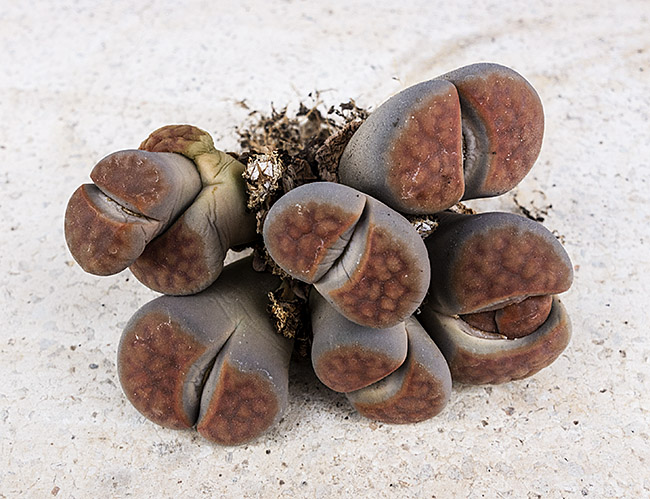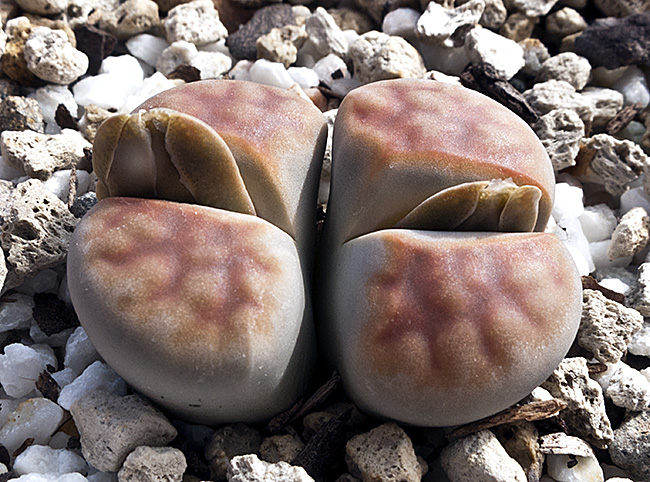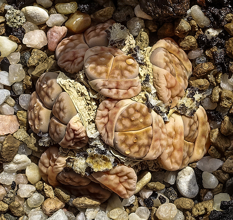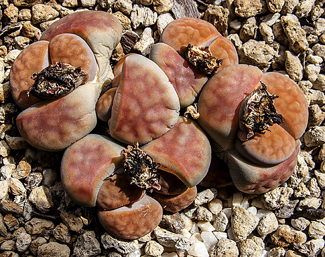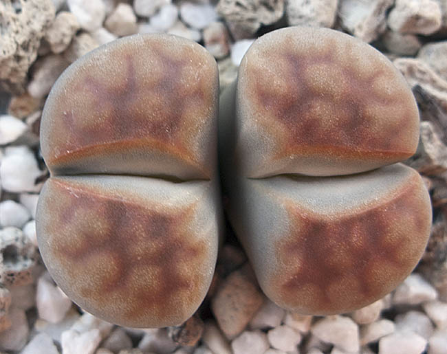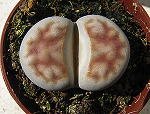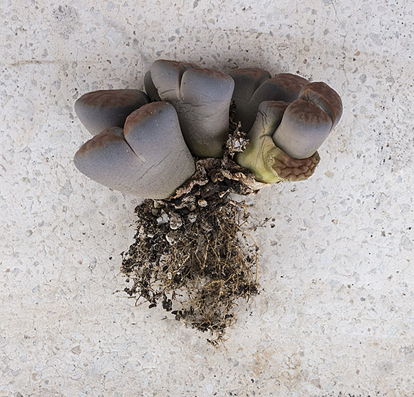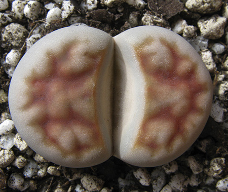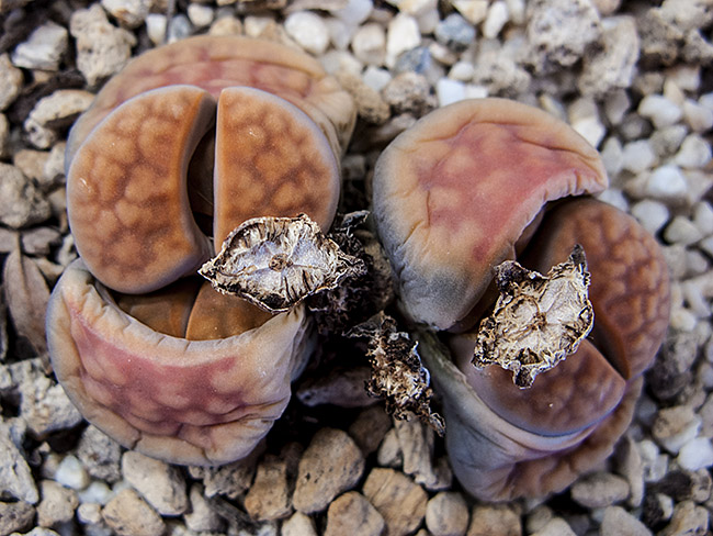 23 de mayo de 2012 (Estaba bastante interesado en ver qué pasaba con la doble regeneración de este lithops (la primera sencilla y la segunda doble a su vez). Como se puede apreciar en esta foto, se están secando las primeras hojas que aparecieron este año y, según parece, sólo van a quedar las dos cabezas gemelas que aparecieron en la segunda regeneración.)
