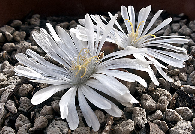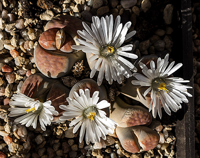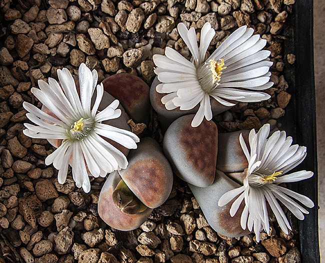 15 de abril de 2012 (Las hojas correspondientes a la cabeza de la temporada anterior ya están completamente secas, pero el proceso de regeneración ha sido triple, es decir de la cabeza inicial salió una nueva cabeza de la que, a su vez, salieron dos nuevas cabezas a los pocos días, por lo tanto en la actualidad existen tres cabezas. Estas rarezas en cuanto al proceso de regeneración, según he leído, se presentan con bastante frecuencia en el caso de la especie L. karasmontana. Estoy regando una vez cada 14 días.)